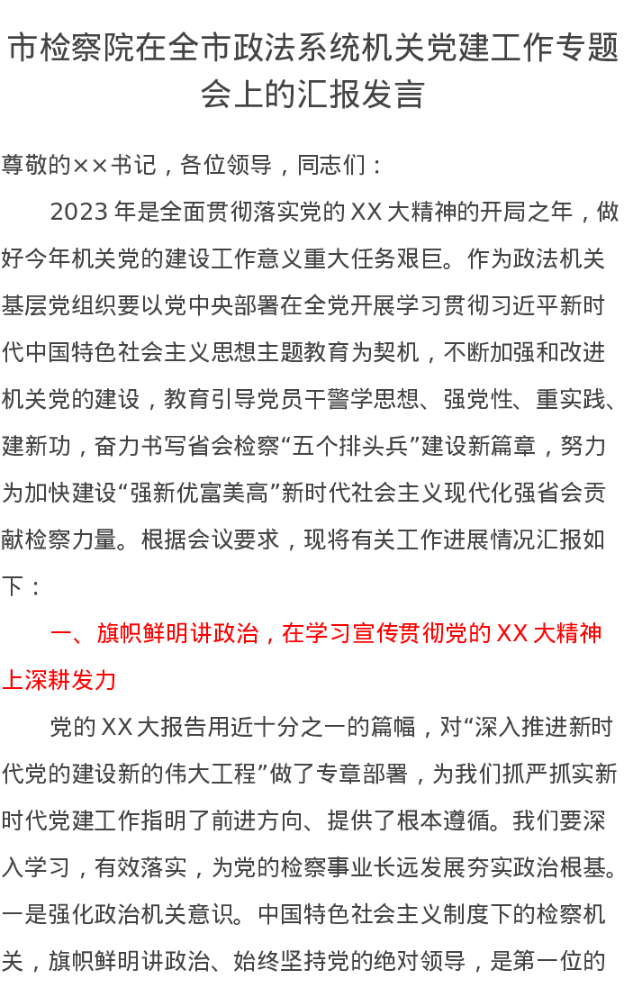 市检察院在全市政法系统机关党建工作专题会上的汇报发言