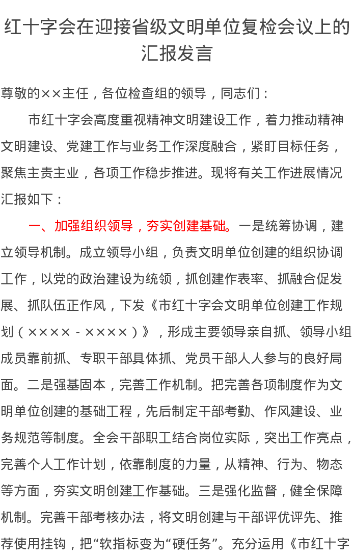 红十字会在迎接省级文明单位复检会议上的汇报发言