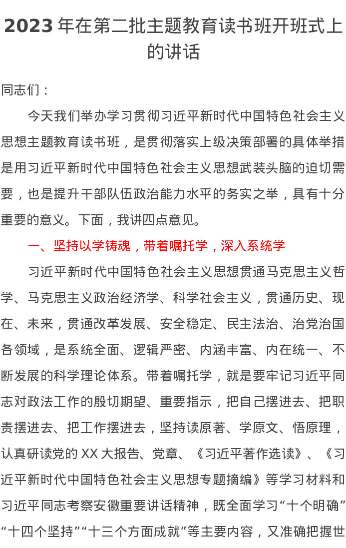 2023年在第二批主题教育读书班开班式上的讲话(特色社会主义思想)
