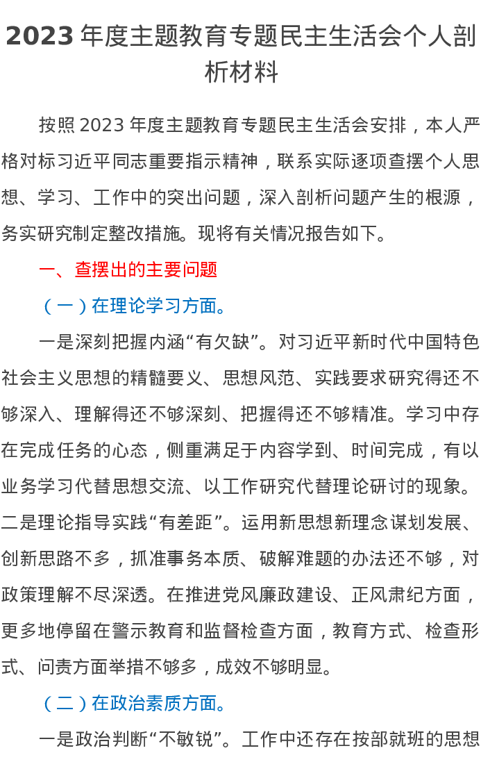 2023年度主题教育专题民主生活会个人剖析材料(六个方面特色社会主义思想)