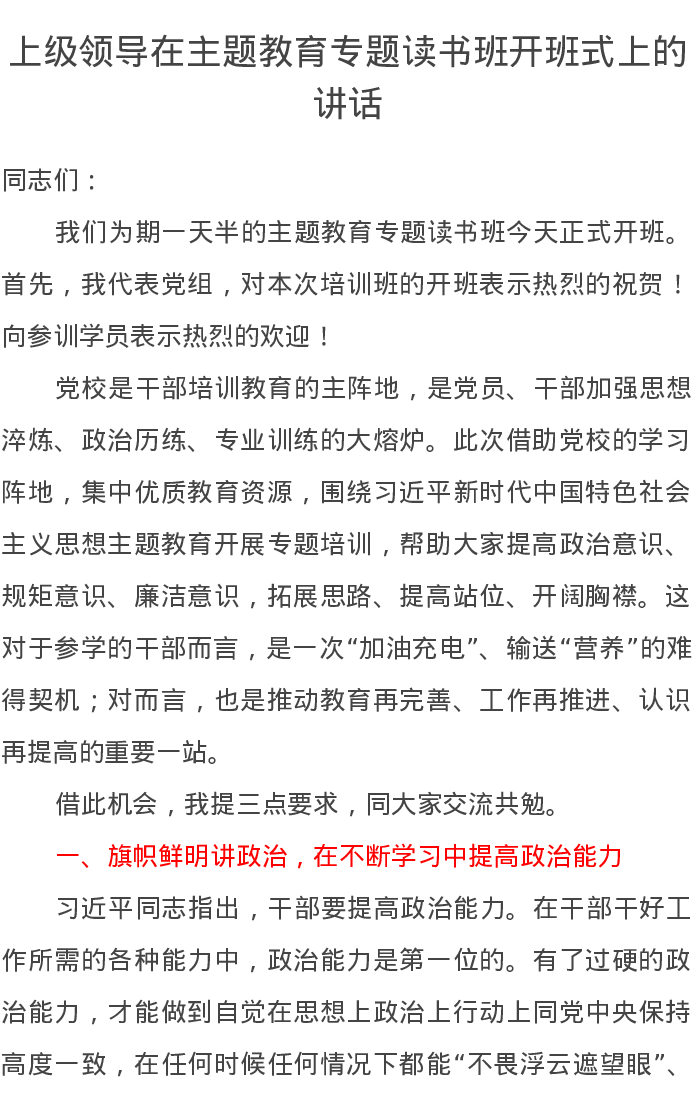 上级领导在主题教育专题读书班开班式上的讲话(特色社会主义思想)