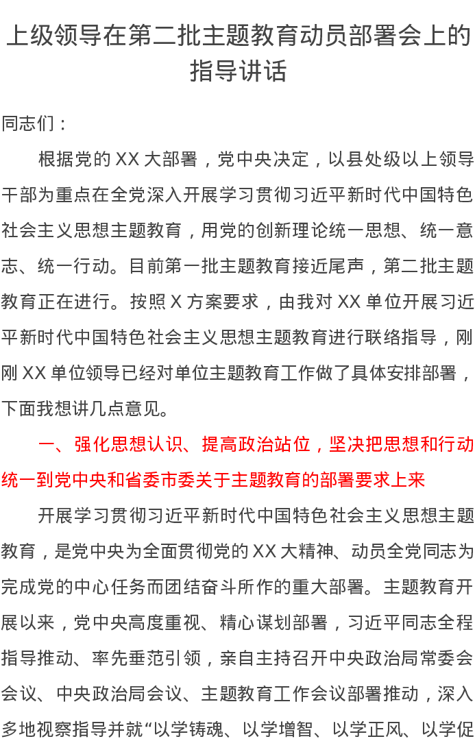上级领导在第二批主题教育动员部署会上的指导讲话(特色社会主义思想)
