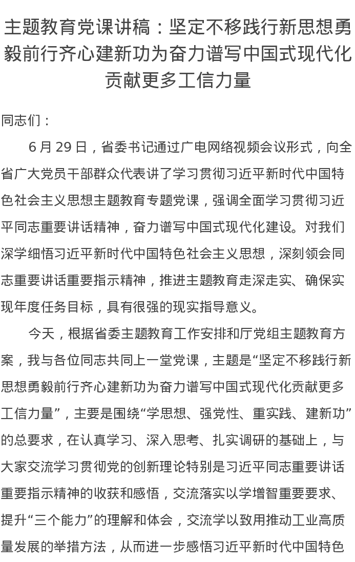 主题教育党课讲稿:坚定不移践行新思想勇毅前行齐心建新功为奋力谱写中国式现代化贡献更多工信力量