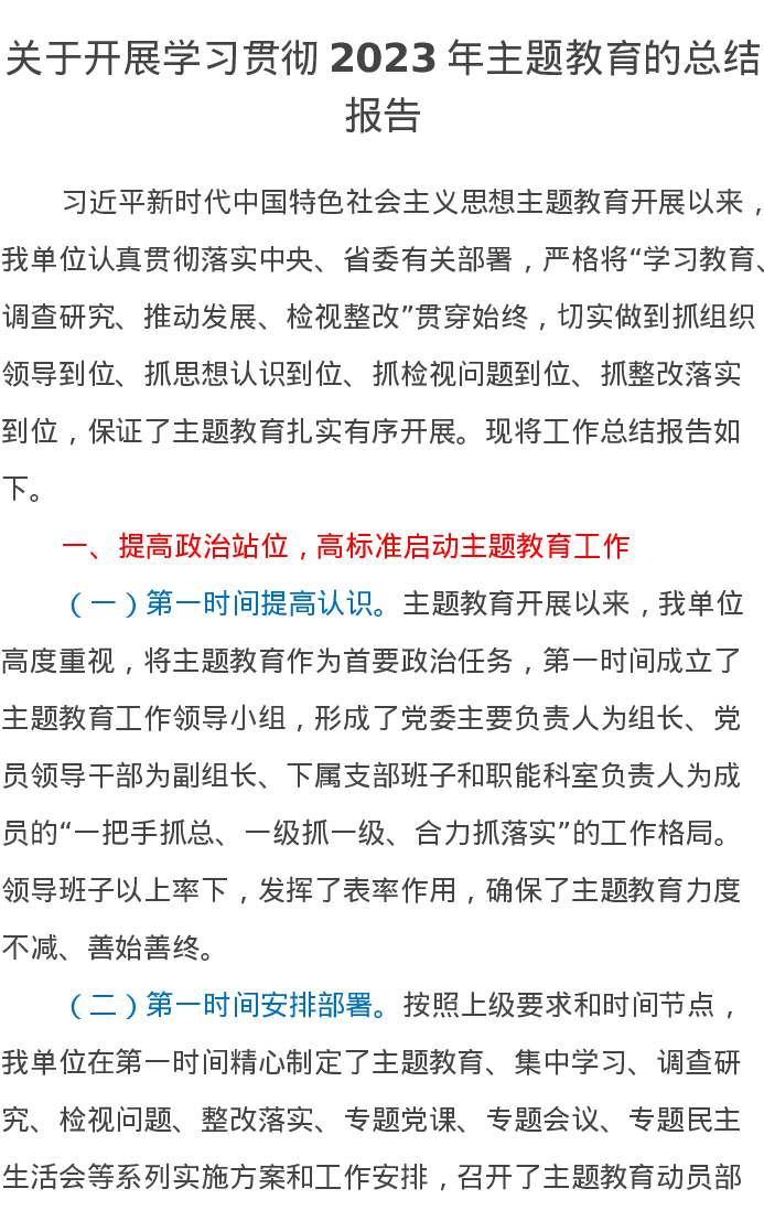 关于开展学习贯彻2023年主题教育的总结报告(特色社会主义思想)