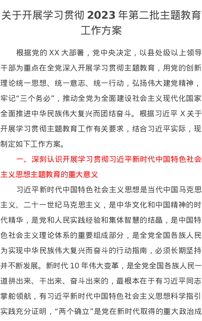 关于开展学习贯彻2023年第二批主题教育工作方案(特色社会主义思想)