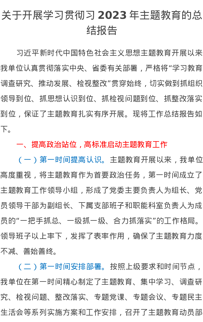 关于开展学习贯彻习2023年主题教育的总结报告(特色社会主义思想)