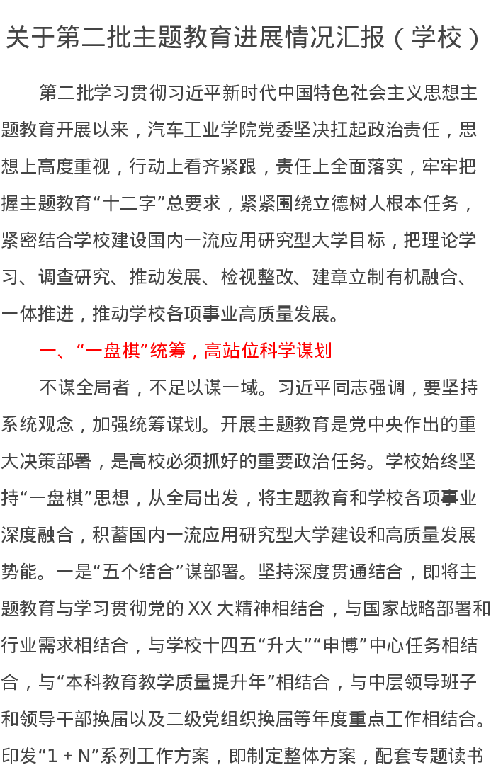 关于第二批主题教育进展情况汇报(学校)特色社会主义思想