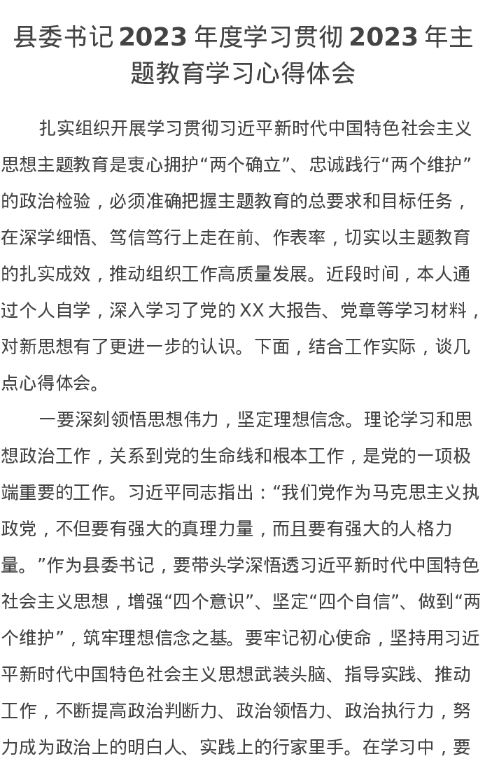 县委书记2023年度学习贯彻2023年主题教育学习心得体会(特色社会主义思想)