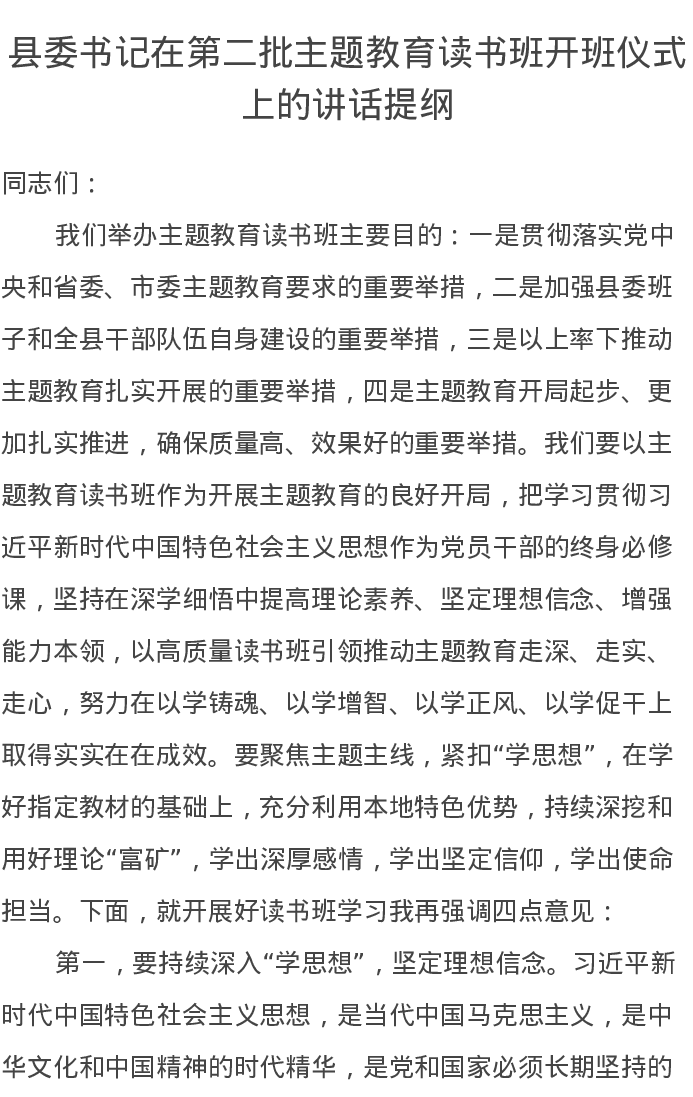 县委书记在第二批主题教育读书班开班仪式上的讲话提纲(特色社会主义思想)