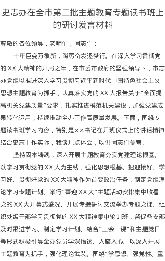 史志办在全市第二批主题教育专题读书班上的研讨发言材料(特色社会主义思想)