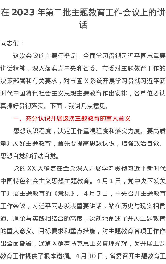 在2023年第二批主题教育工作会议上的讲话(特色社会主义思想)