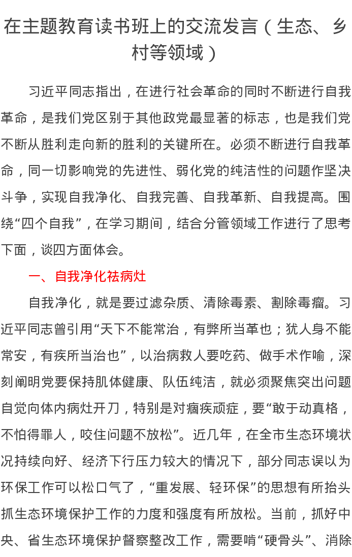在主题教育读书班上的交流发言(生态、乡村等领域)特色社会主义思想