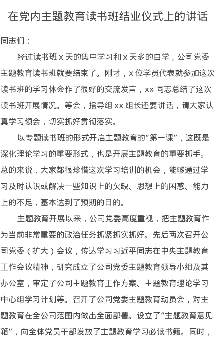 在党内第二批主题教育读书班结业仪式上的讲话2(特色社会主义思想)