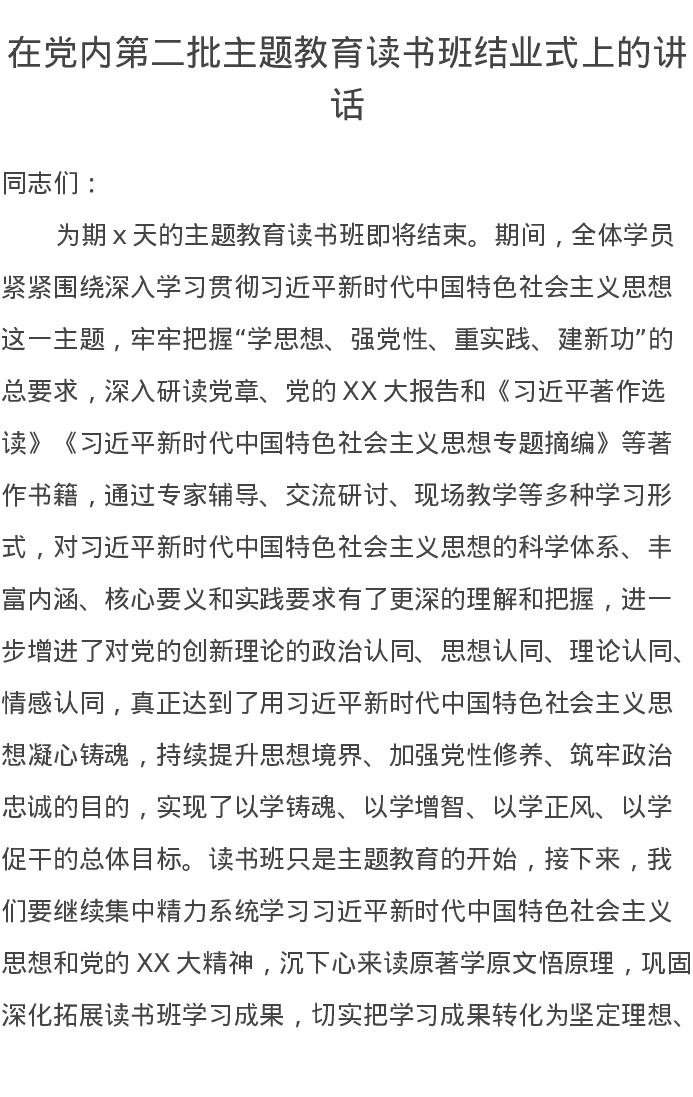 在党内第二批主题教育读书班结业式上的讲话(特色社会主义思想)