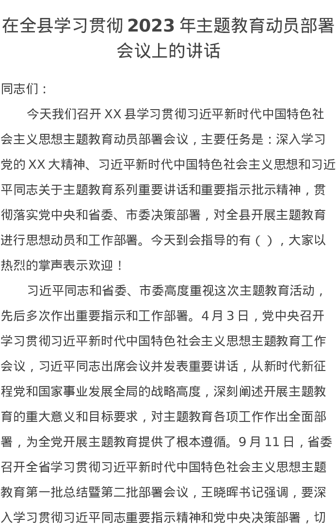 在全县学习贯彻2023年第二批主题教育动员部署会议上的讲话(特色社会主义思想)