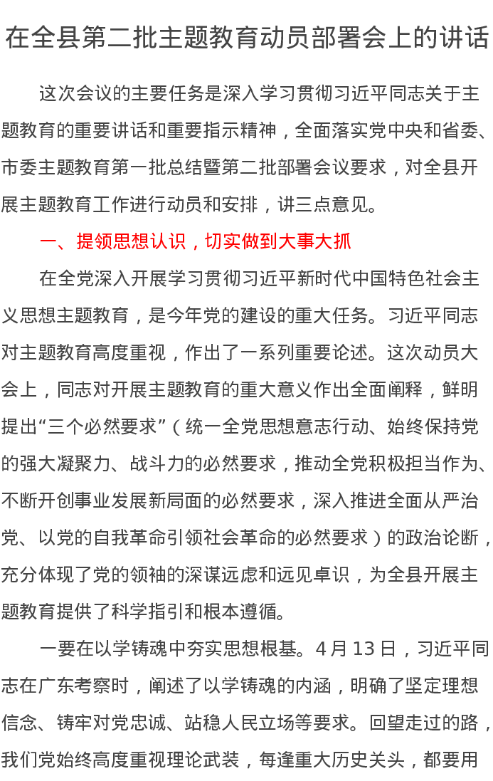 在全县第二批主题教育动员部署会上的讲话(特色社会主义思想)