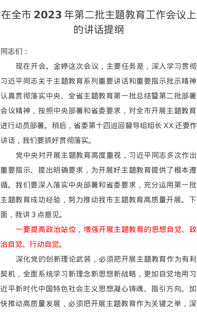 在全市2023年第二批主题教育工作会议上的讲话提纲(特色社会主义思想)