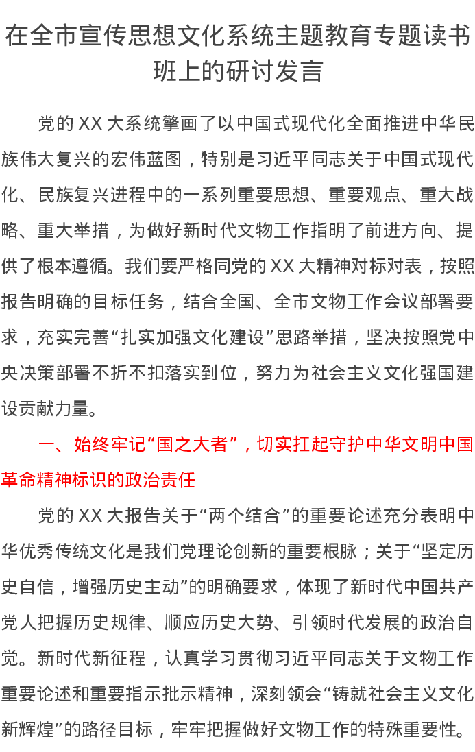 在全市宣传思想文化系统主题教育专题读书班上的研讨发言(特色社会主义思想)