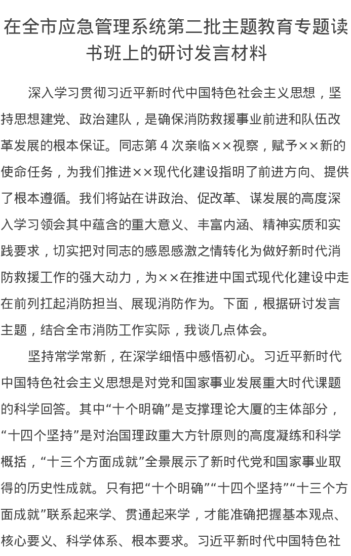 在全市应急管理系统第二批主题教育专题读书班上的研讨发言材料(特色社会主义思想)