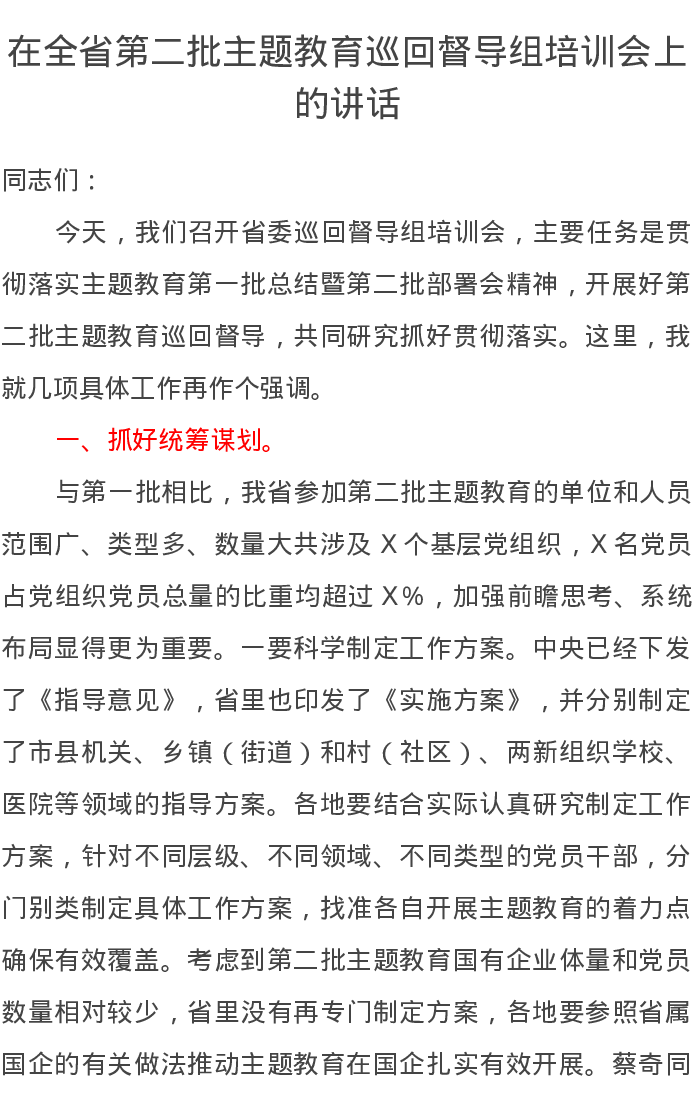 在全省第二批主题教育巡回督导组培训会上的讲话(特色社会主义思想)
