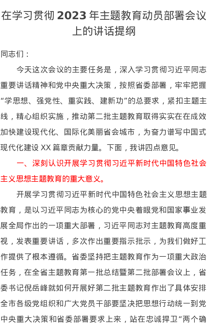 在学习贯彻2023年主题教育动员部署会议上的讲话提纲(特色社会主义思想)