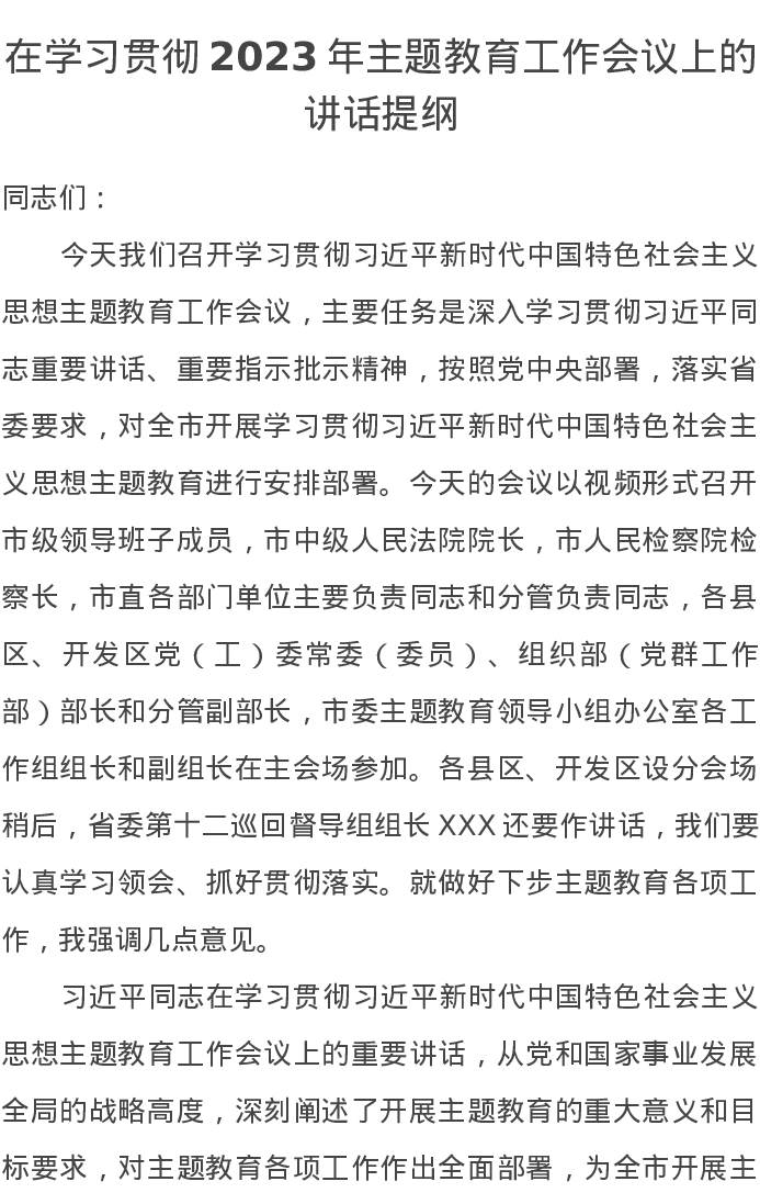 在学习贯彻2023年第二批主题教育工作会议上的讲话提纲(特色社会主义思想)