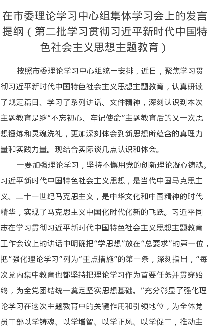 在市委理论学习中心组集体学习会上的发言提纲(第二批学习贯彻习近平新时代中国特色社会主义思想主题教育)