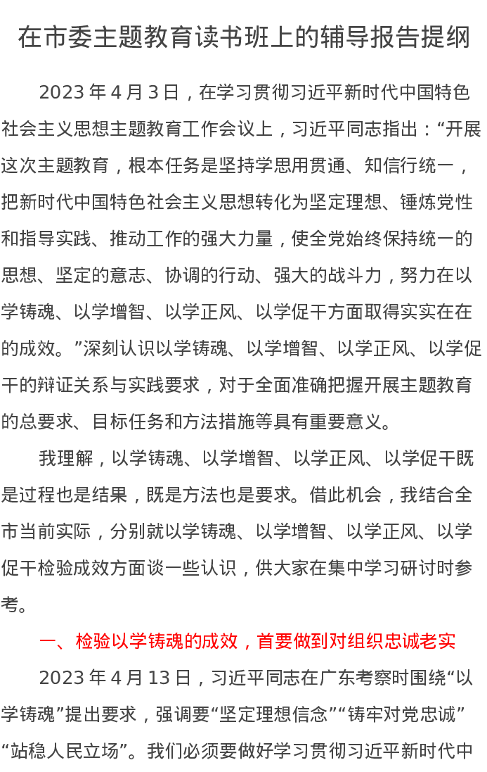 在市委第二批主题教育读书班上的辅导报告提纲(特色社会主义思想)