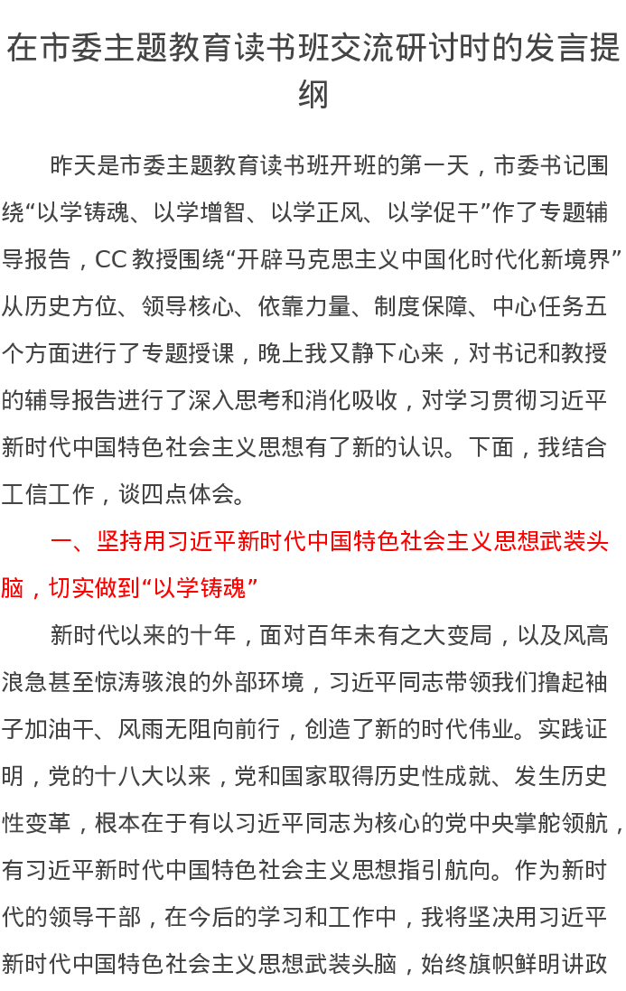 在市委第二批主题教育读书班交流研讨时的发言提纲(特色社会主义思想)