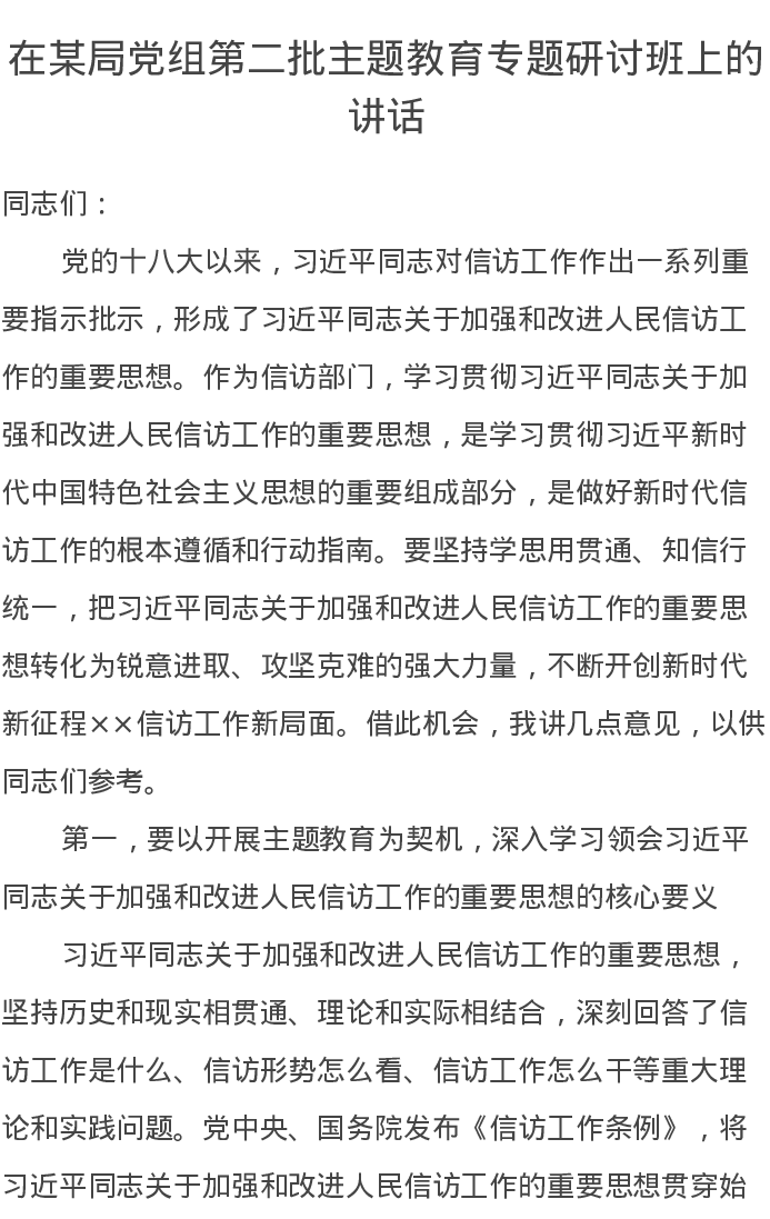在某局党组第二批主题教育专题研讨班上的讲话(特色社会主义思想)