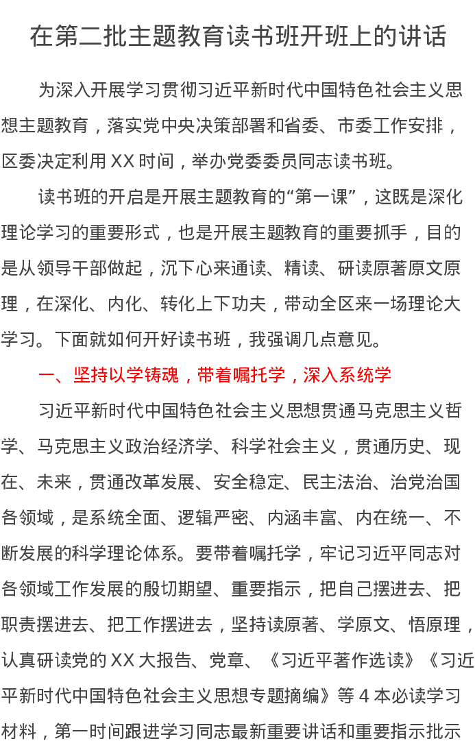在第二批主题教育读书班开班上的讲话(特色社会主义思想)