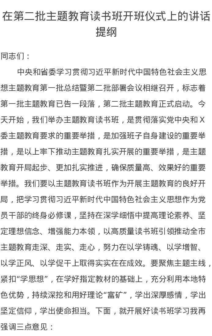 在第二批主题教育读书班开班仪式上的讲话提纲(特色社会主义思想)