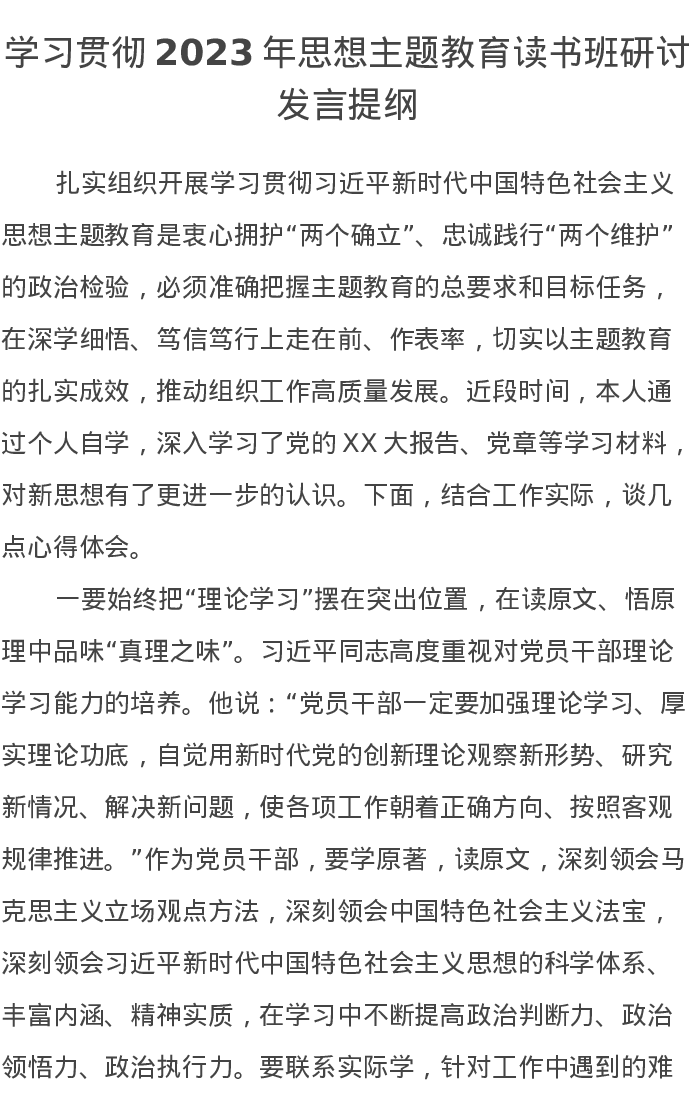 学习贯彻2023年思想主题教育读书班研讨发言提纲(特色社会主义思想)