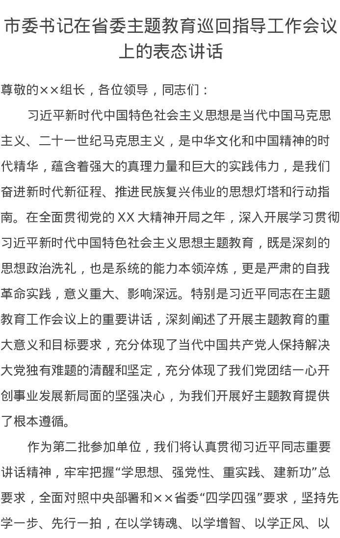 市委书记在省委主题教育巡回指导工作会议上的表态讲话(特色社会主义思想)