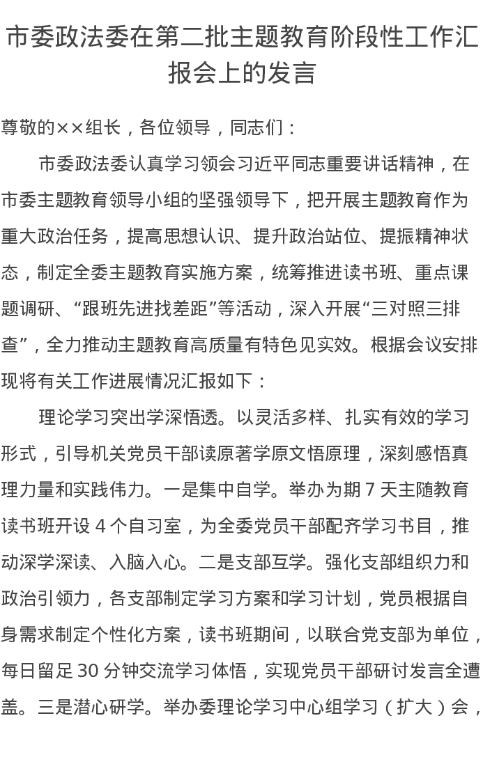 市委政法委在第二批主题教育阶段性工作汇报会上的发言(特色社会主义思想)