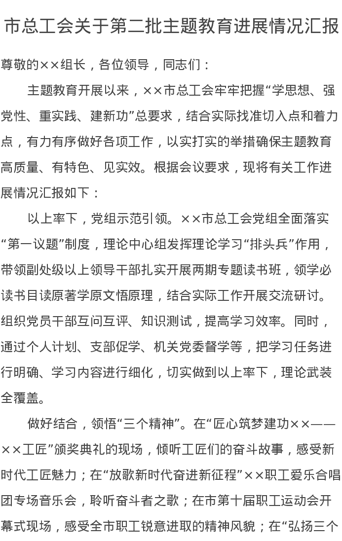 市总工会关于第二批主题教育进展情况汇报(特色社会主义思想)