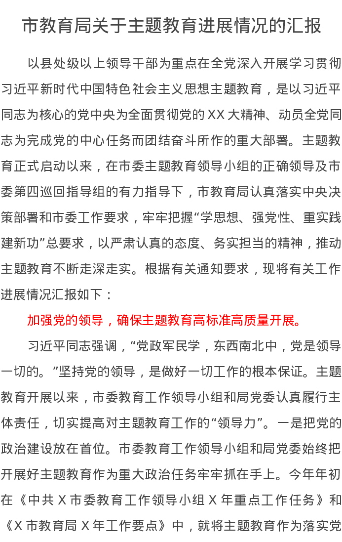 市教育局关于主题教育进展情况的汇报(特色社会主义思想)