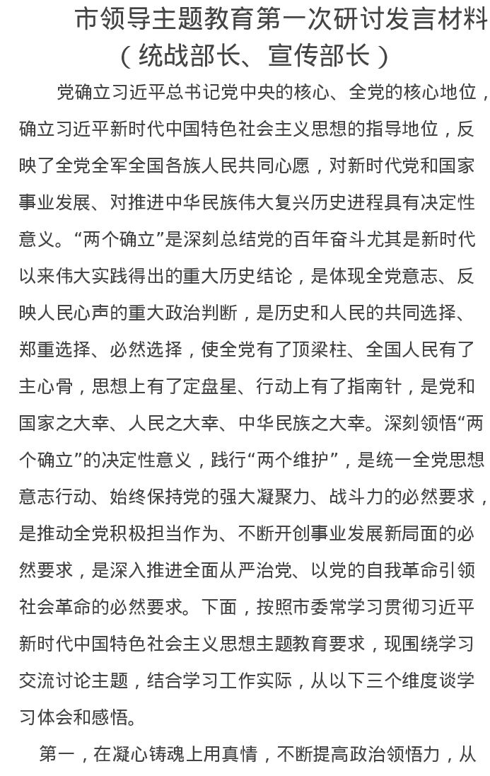 市领导主题教育第一次研讨发言材料(统战部长、宣传部长)特色社会主义思想