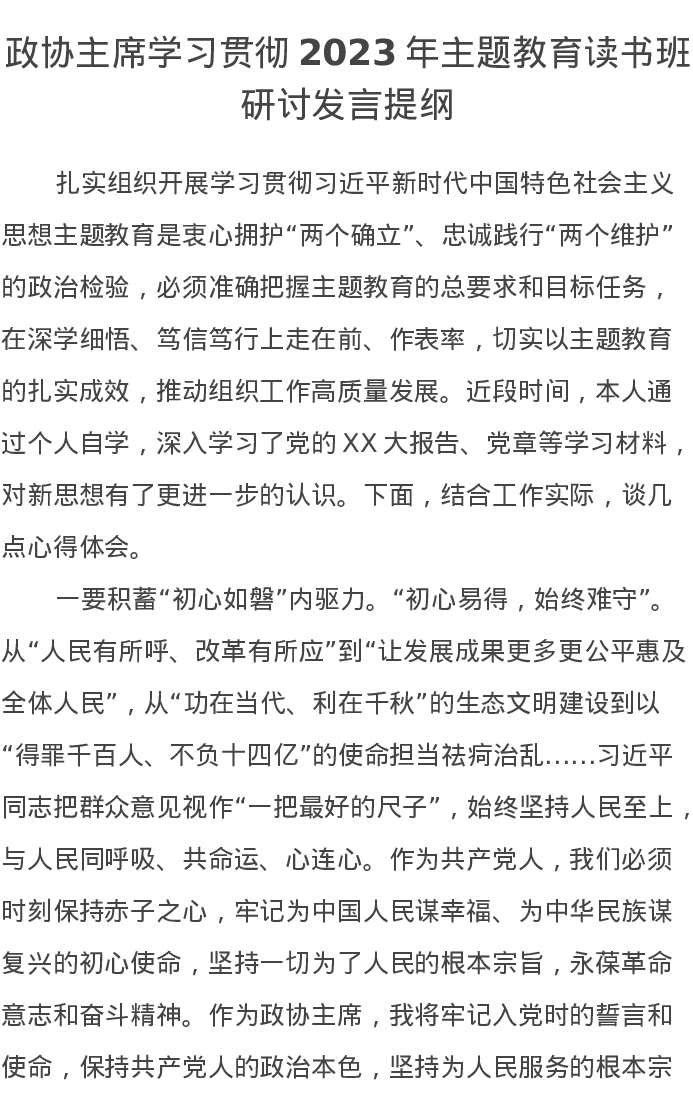 政协主席学习贯彻2023年主题教育读书班研讨发言提纲(特色社会主义思想)