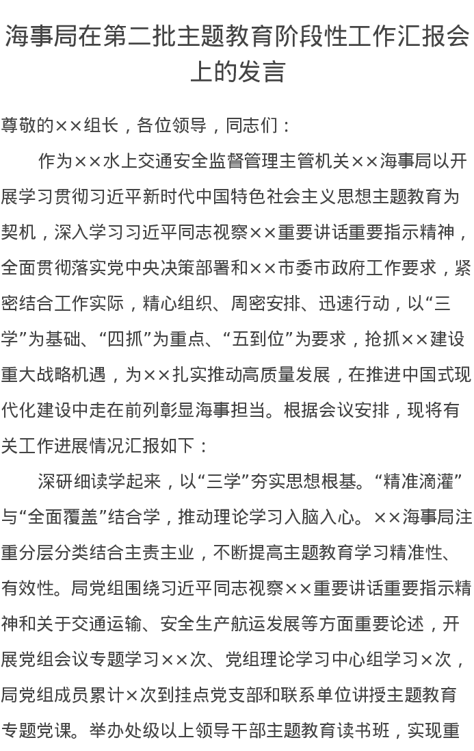 海事局在第二批主题教育阶段性工作汇报会上的发言(特色社会主义思想)