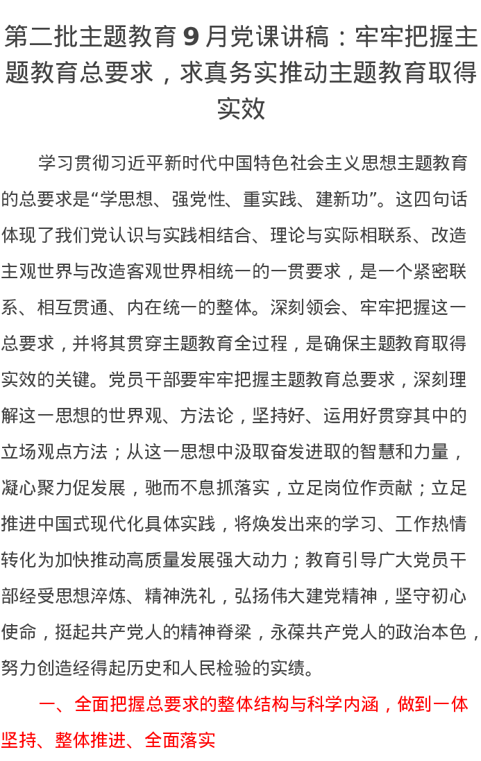 第二批主题教育9月党课讲稿:牢牢把握主题教育总要求,求真务实推动主题教育取得实效(特色社会主义思想)