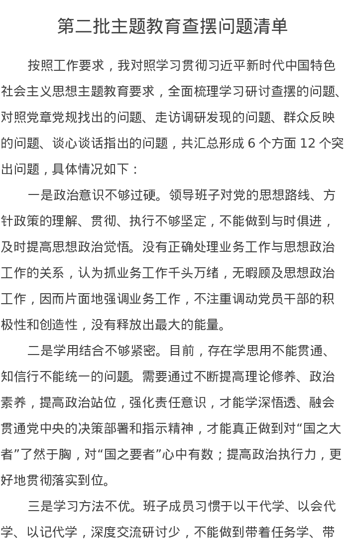第二批主题教育查摆问题清单(特色社会主义思想)