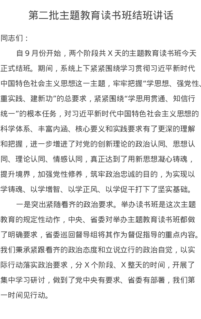 第二批主题教育读书班结班讲话(特色社会主义思想)