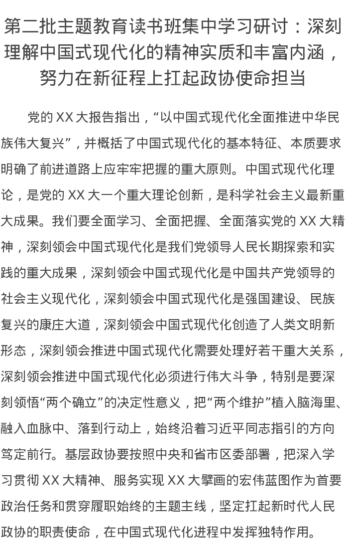 第二批主题教育读书班集中学习研讨:深刻理解中国式现代化的精神实质和丰富内涵,努力在新征程上扛起政协使命担当(特色社会主义思想)