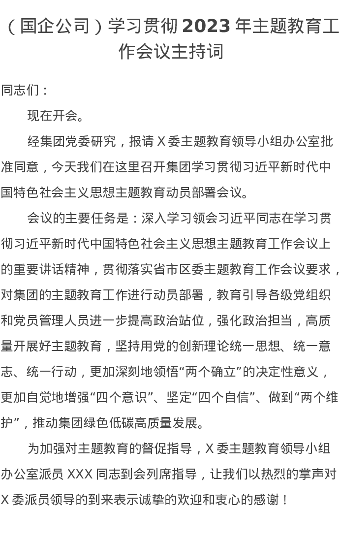 (国企公司)学习贯彻2023年第二批主题教育工作会议主持词(特色社会主义思想)