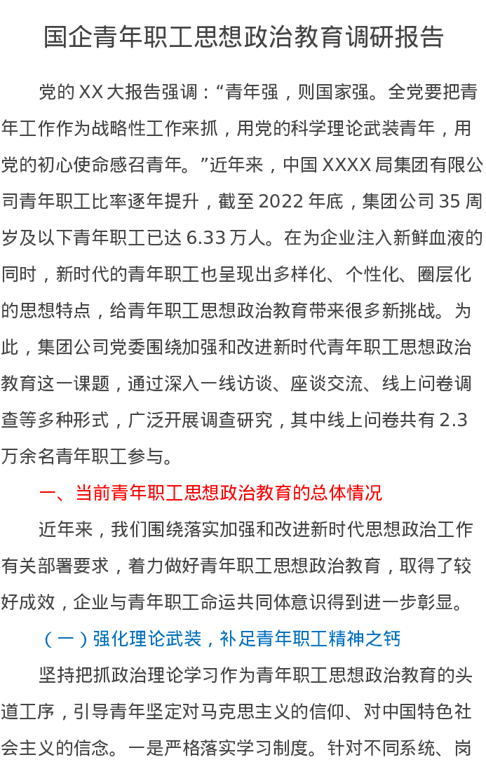 国企青年职工思想政治教育调研报告