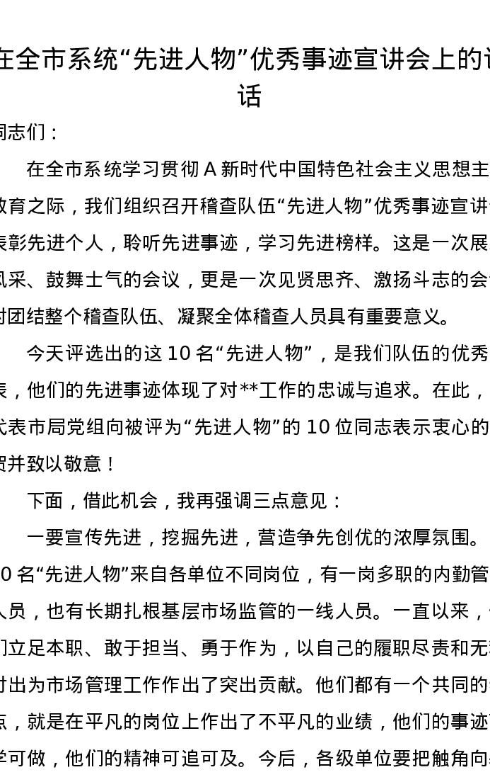 在全市系统“先进人物”优秀事迹宣讲会上的讲话
