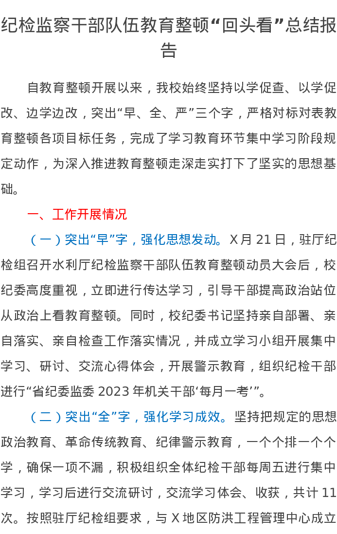 纪检监察干部队伍教育整顿“回头看”总结报告