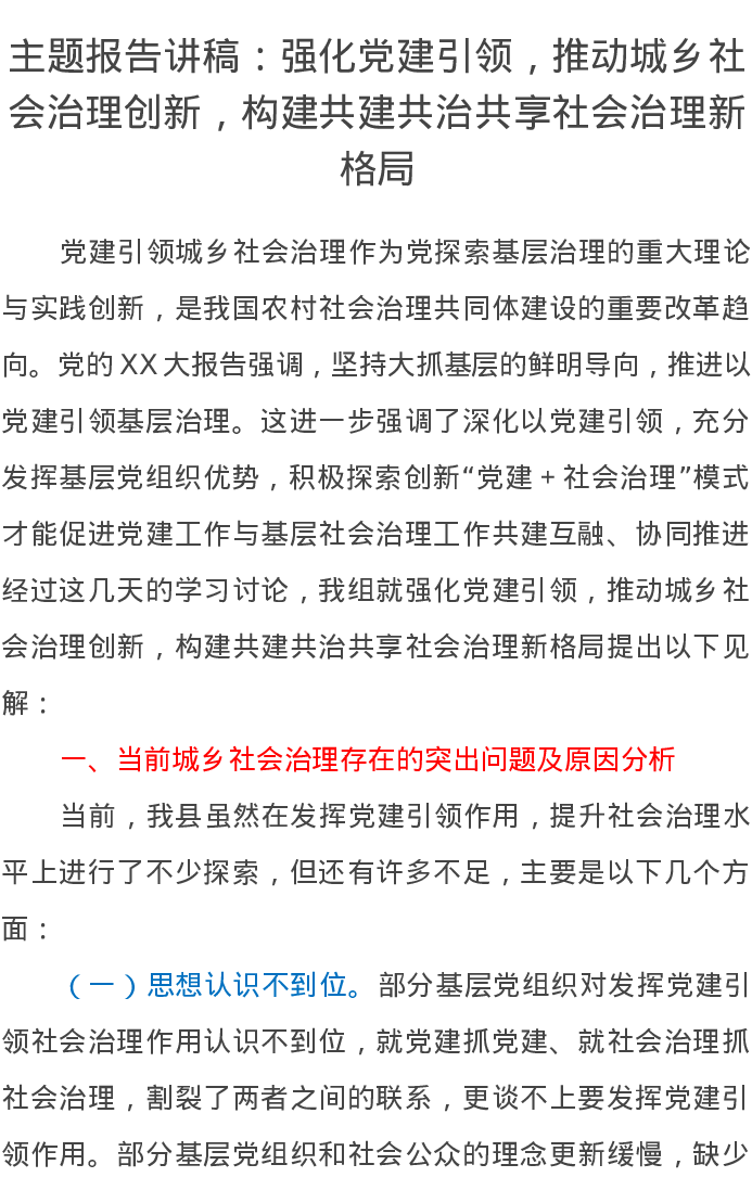 主题报告讲稿:强化党建引领,推动城乡社会治理创新,构建共建共治共享社会治理新格局
