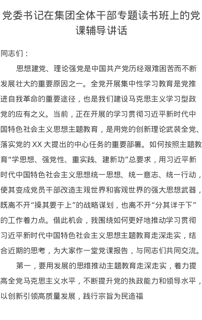 党委书记在集团全体干部专题读书班上的党课辅导讲话